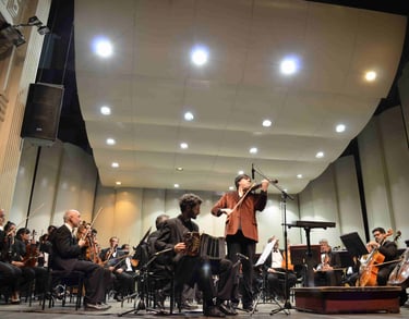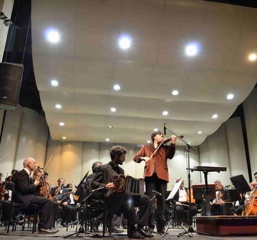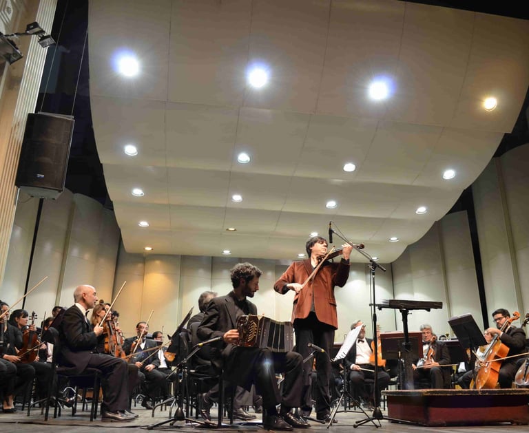 Se trata de la adaptación del tango a grandes formaciones orquestales, incluyendo un bandoneón en la amplia paleta de colores sinfónica. Transitando obras propias, como el "Con-cierto-tango" para bandoneón y orquesta, y arreglos de tangos clásicos, este formato permite llevar el género a teatros de excelencia, satisfaciendo al público más exigente.